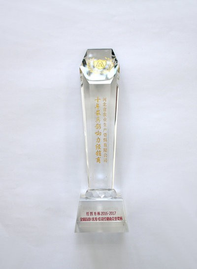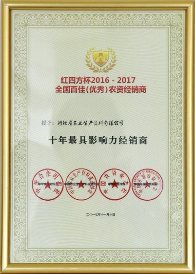 公司榮獲全國(guó)百佳(優(yōu)秀)農(nóng)資經(jīng)銷商 “十年最具影響力經(jīng)銷商”稱號(hào)