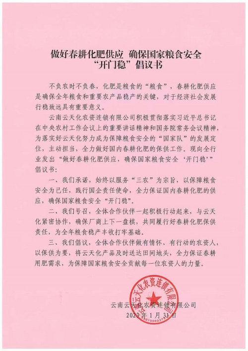 近日,云南云天化農(nóng)資連鎖有限公司向全國發(fā)出《做好春耕化肥供應(yīng)確保國家糧食安全“開門穩(wěn)”倡議書》。作為云天化的戰(zhàn)略合作伙伴,我們深表贊同并積極響應(yīng)。春耕在即,作為河北省農(nóng)資保供重點企業(yè),河北省農(nóng)資集團將與云天化共同行動,全力保證春耕的用肥需求,為全省的農(nóng)業(yè)生產(chǎn)貢獻力量。
