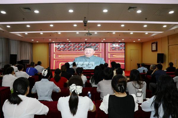 觀看現(xiàn)場(chǎng)氣氛莊重?zé)崃?,全體人員全神貫注、心潮澎湃。屏幕上,受閱部隊(duì)官兵軍容嚴(yán)整、意氣風(fēng)發(fā),新型武器裝備悉數(shù)亮相、威武雄壯,充分展示了新時(shí)代國防和軍隊(duì)建設(shè)的輝煌成就,展現(xiàn)了人民軍隊(duì)的強(qiáng)軍風(fēng)采和中華民族走向偉大復(fù)興的鏗鏘步伐。英姿颯爽的隊(duì)伍、整齊劃一的步伐、鏗鏘有力的口號(hào),無一不令人熱血澎湃,引發(fā)了現(xiàn)場(chǎng)強(qiáng)烈共鳴和陣陣掌聲。