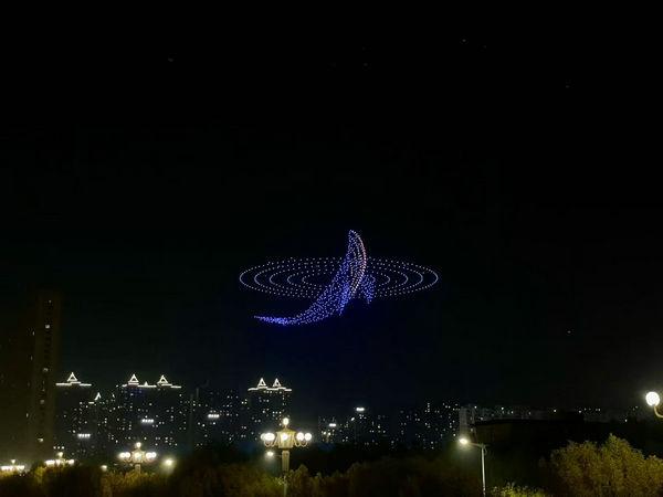 19點,無人機編隊表演拉開序幕。千架無人機如星河般升空,在夜空中排列出 “千年儒鄉(xiāng) 一湖靈秀”、“我愛衡水”、中國龍、鳳凰、藍鯨等多種圖案,將冀興臻園與城市共進、共建理想家園的美好遠景集中呈現(xiàn)。