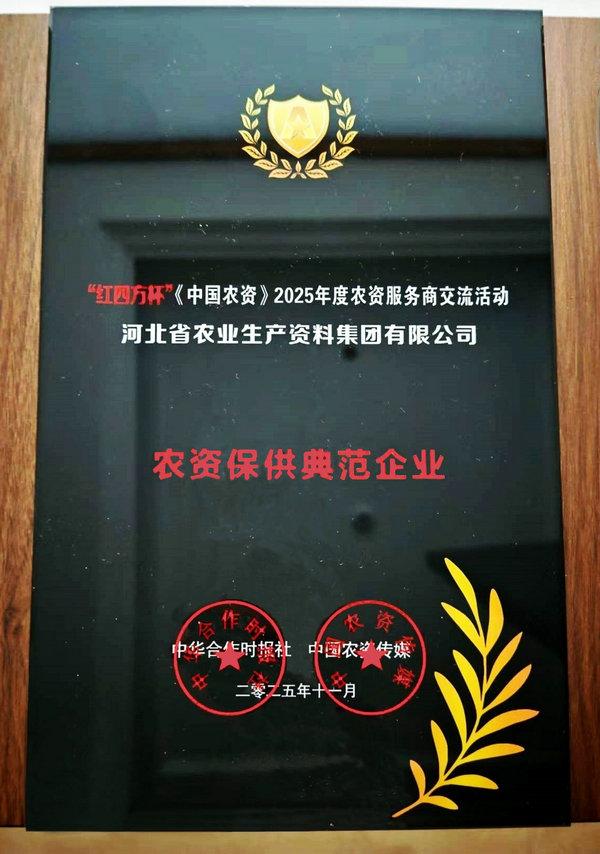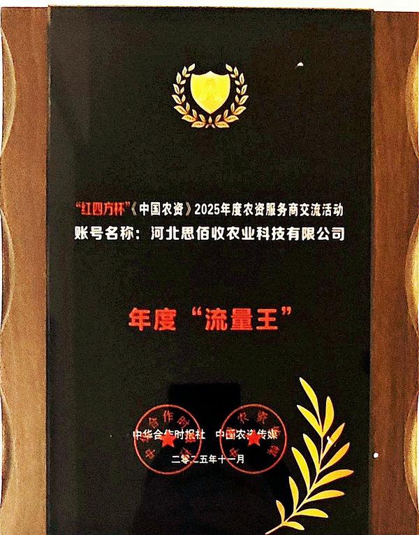 ? 同日,由中華合作時報社、中國農資傳媒主辦的“‘紅四方杯’尋找流量王 ·《中國農資》2025年度農資服務商交流活動暨《國肥之光第二季》”在南京舉行。會上發(fā)布了2024-2025年度農資服務商典范企業(yè)名單及年度“流量王”名單,集團公司榮獲“農資保供典范企業(yè)”榮譽稱號,旗下河北思佰收農業(yè)科技有限公司視頻號榮獲年度“流量王”榮譽稱號。