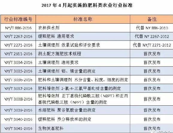 根據農業(yè)部和工信部公告,自2017年4月1日起,與肥料相關的12項農業(yè)行業(yè)標準和7項化工行業(yè)標準正式實施。12項農業(yè)行業(yè)標準主要涉及農林保水劑、土壤調理劑通用要求、緩釋肥料通用要求、生物炭基肥料、測土配方施肥技術規(guī)程等,7項化工行業(yè)標準主要涉及含腐植酸肥料、含海藻酸肥料、水溶性磷酸一銨、肥料級磷酸二氫鉀等新型肥料。