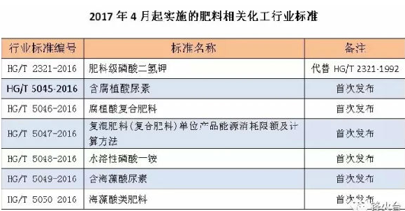 為了推進化肥行業(yè)轉型升級,工信部提出要大力調整產品結構,鼓勵開發(fā)高效、環(huán)保新型肥料。2016年發(fā)布了含腐植酸尿素、腐植酸復合肥、含海藻酸尿素、海藻酸類肥料、水溶性磷酸一銨、肥料級磷酸二氫鉀6項化工行業(yè)標準,自2017年4月1日起正式實施。